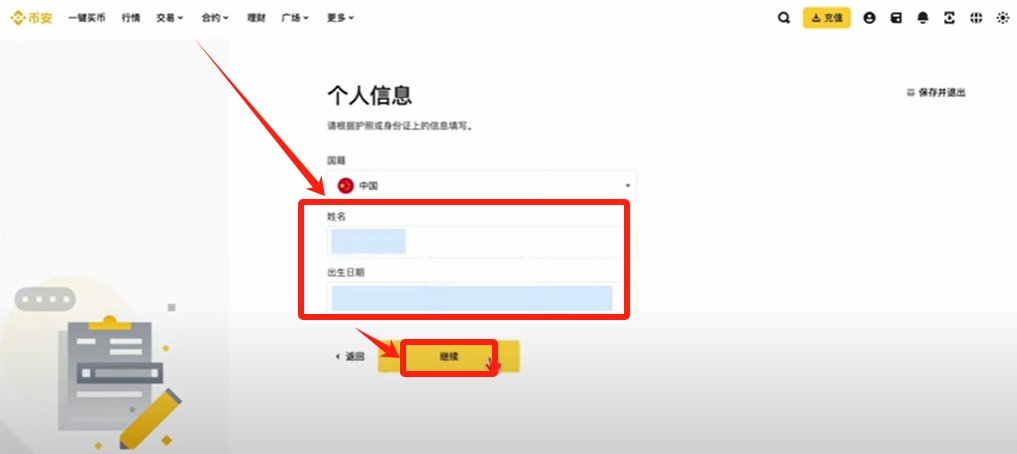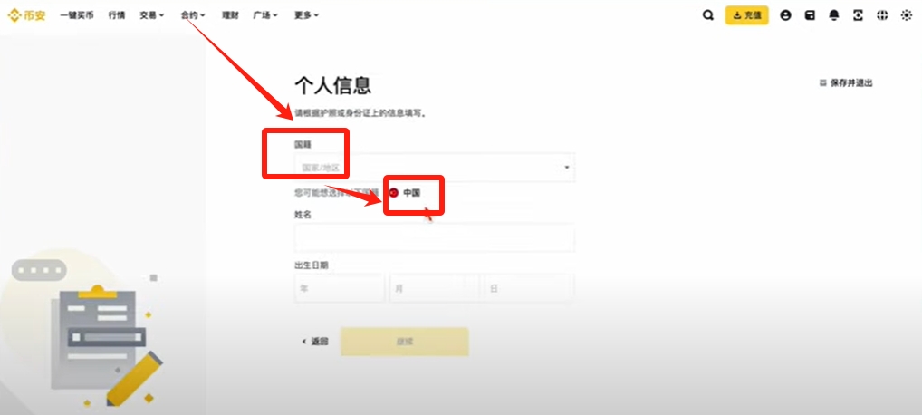接下来就来到了身份认证环节,也就是我们常说的KYC。居住国家和地区这里根据自己的实际情况如实选择就可以了。点击【继续】。