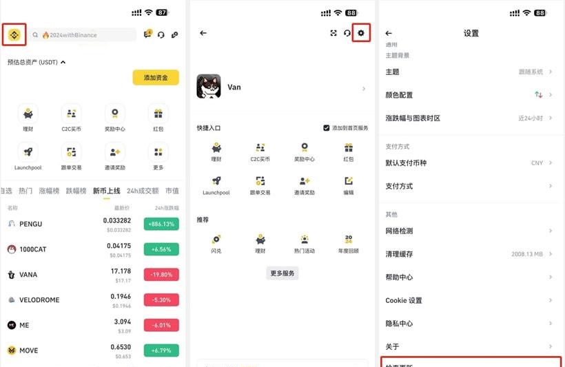 为了确保能够使用币安Web3钱袋和币安 Alpha,首先需要更新币安APP至 2.92版本 或更高版本。您可以通过币安APP首页左上角的设置中检查更新。