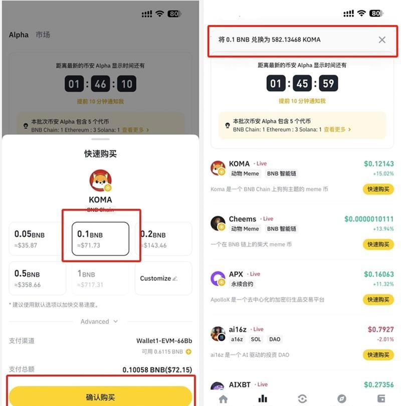 1、当代币上线时,你可以通过币安Alpha页面的快速购买功能进行购买。