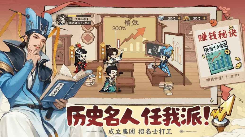 人才招揽系统亦是本作亮点之一。玩家可延聘历史名士加入团队,如曹操、李白、刘备等人物均将以符合其时代特质的形象登场,各自携带专属管理加成与事件触发机制。他们并非简单NPC,而是能随玩家经营节奏逐步成长、影响全局发展的核心伙伴。