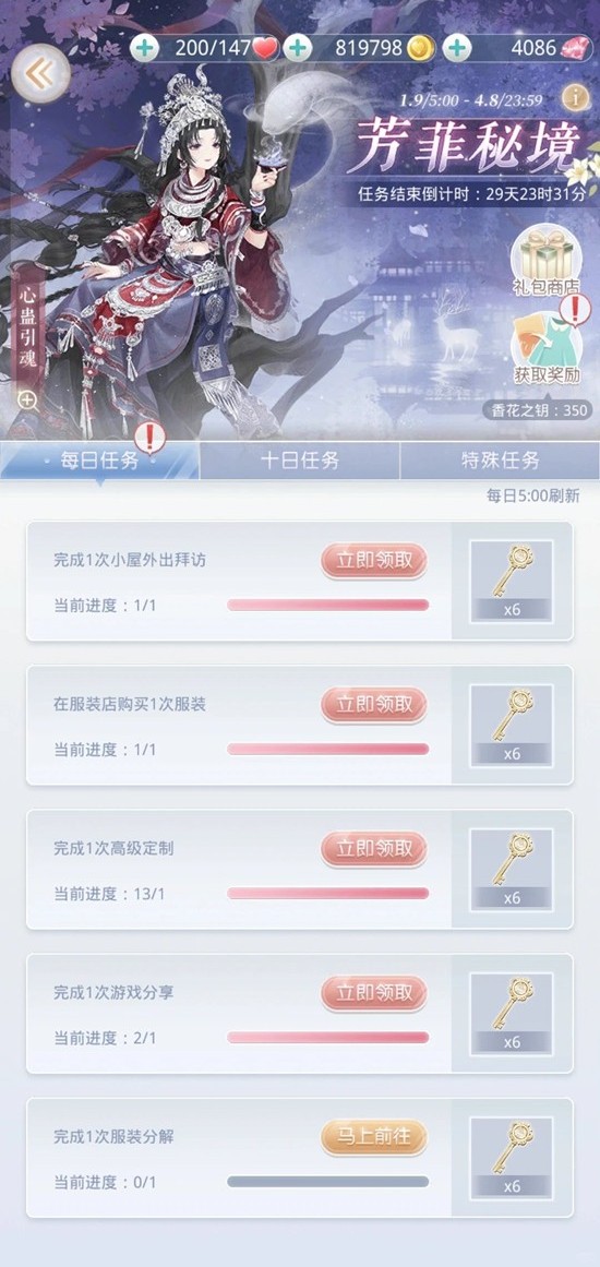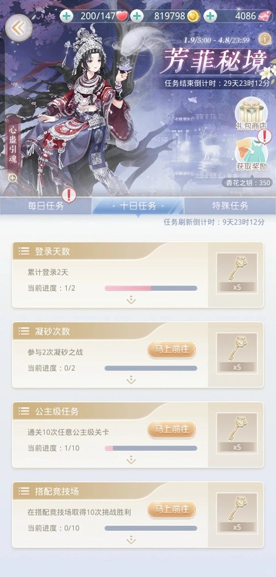 注意!不要先做日常,先开秘境再看对应的任务做,部分日常任务是算在秘境里的,里面有几套可以选择,第一次免费一个月获得,第二次需要200钻石再开启,也是任意选择套装,获取的代币是有多余的,尽量做满任务可以拿完一套的。