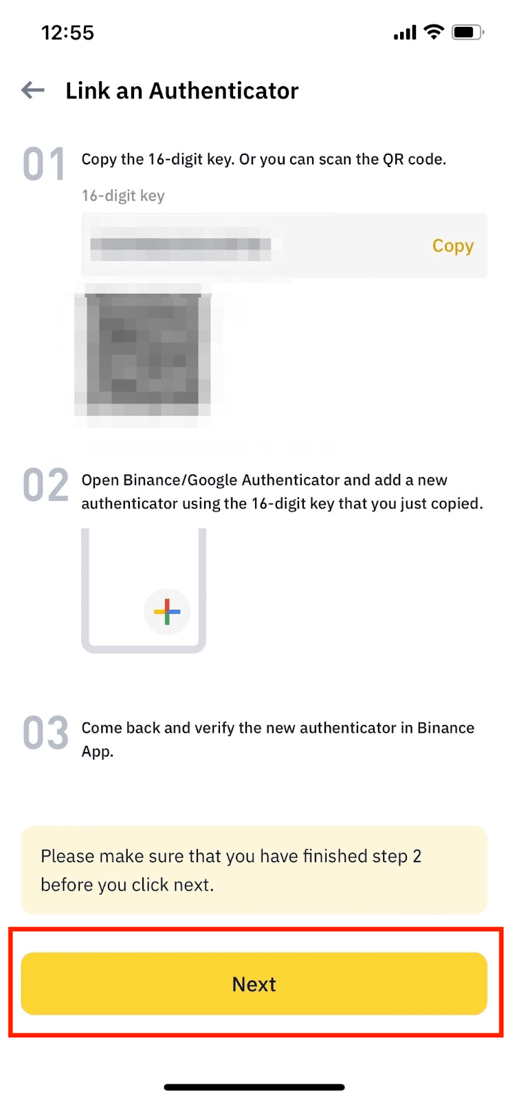 4.返回币安APP并点击【下一步】继续操作。