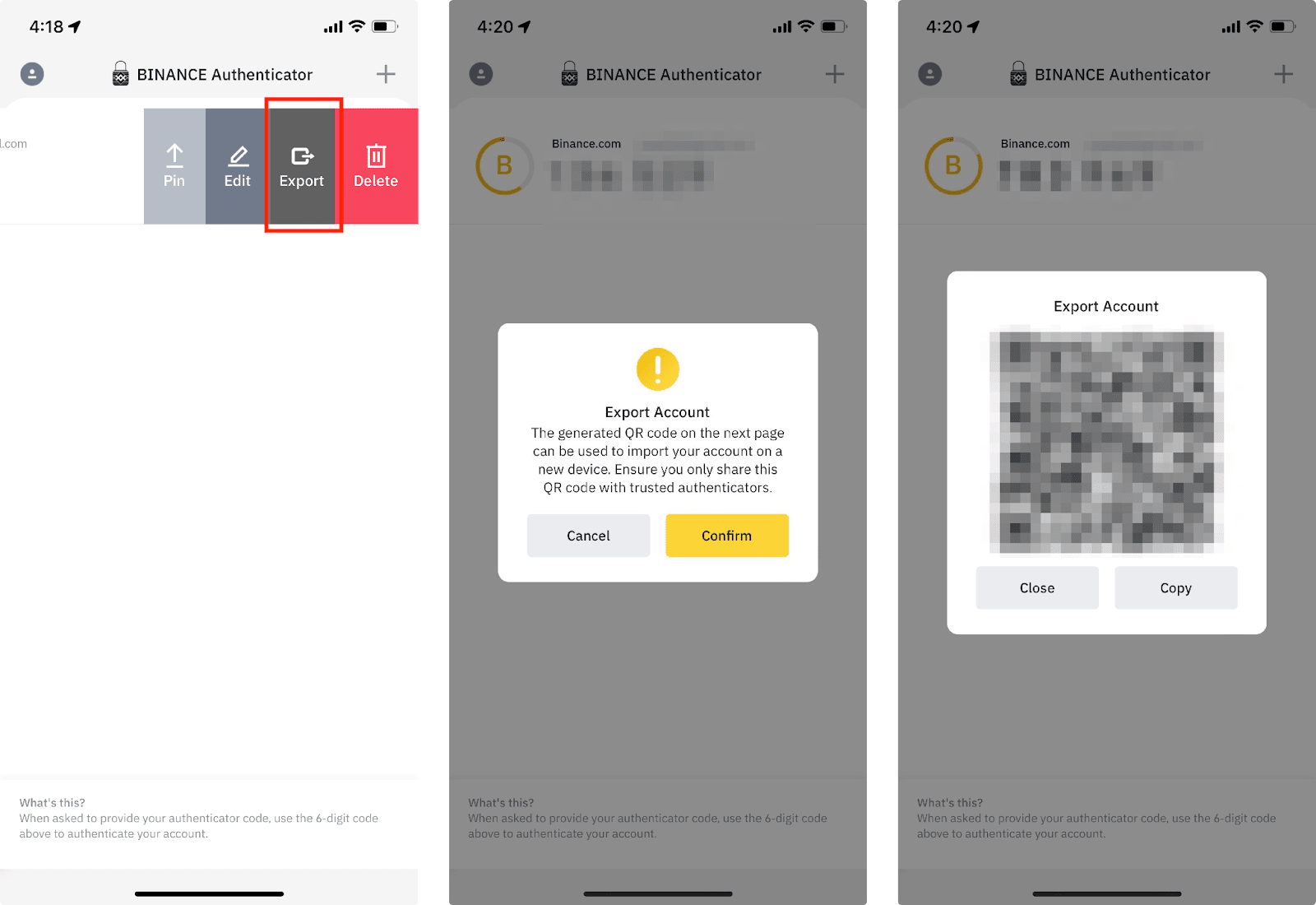 4.您可以将与币安验证器绑定的账户导出到另一台设备。点击【导出】并使用新设备扫描二维码。