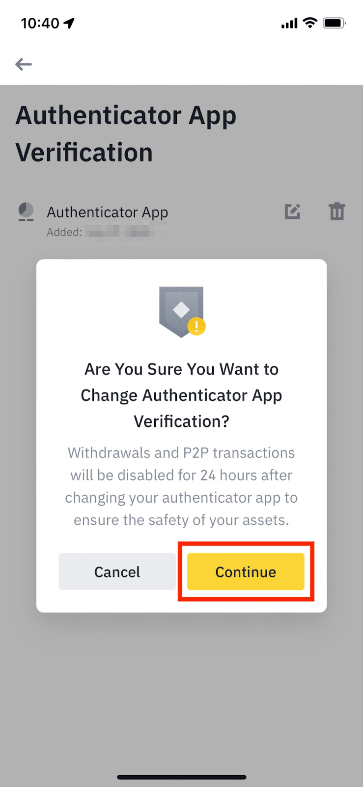 2.仔细阅读弹窗里的提示信息,然后点击【继续】。请注意:为了保护账户的资产安全,更改验证器后,提钱和C2C交易将停用24小时。