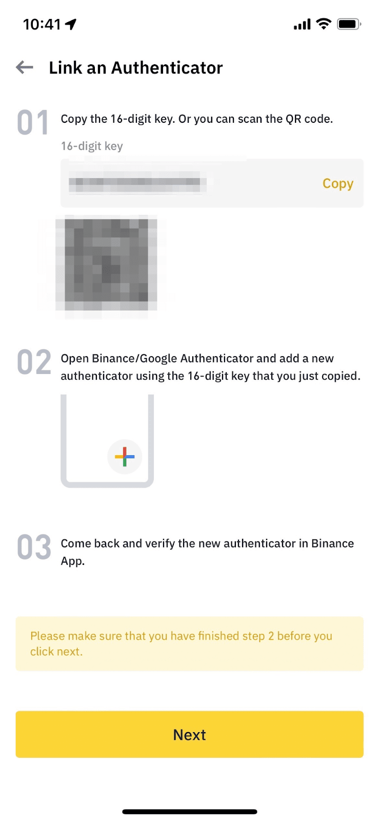 3.系统将显示一个二维码和设置密钥。复制该设置密钥。在BAuthenticator设置完毕之前,请勿点击【下一步】。打开您的币安验证器App,然后点击【扫描二维码】扫描相应的二维码。如无法扫描,请点击【输入设置密钥】手动输入设置密钥码。您将看到一个名为“Binance.com”的新账户已添加至您的币安验证器。