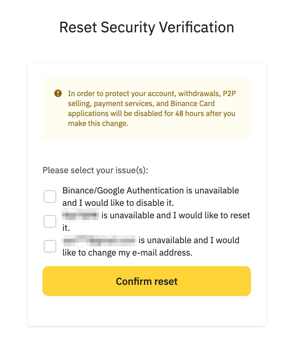 (2.此时将显示一个弹窗。仔细阅读弹窗里的提示信息,然后点击【确认】。为确保您的账户安全,在重置2FA设备后,您的提钱、C2C出售、支付服务和币安卡服务等功能将被禁用48小时。
