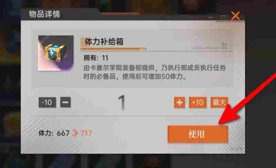 找到需要的道具之后直接点击,会弹出详细信息和使用的选项。以体力补给箱为例,点击使用按钮后,它会立刻为玩家恢复一定数量的体力值。体力在龙族卡塞尔之门里面用处很大,进行主线任务、挑战副本等玩法都需要消耗体力,所以记得及时使用背包里的补给道具。
