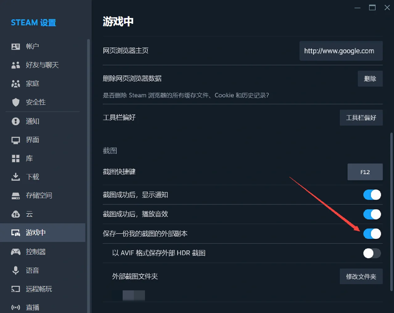 Steam的默认截图快捷键是F12,在截图保存完游戏后,点击Steam上方的查看,可以看到有截图选项,选择截图选项后就可以看到已截过的图,再选择右上角设置后可以更改截图的快捷键和外部截图文件夹。