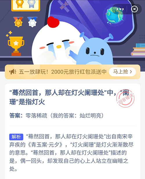 蓦然回首那人却在灯火阑珊处中阑珊是指灯火 支付宝蚂蚁庄园4月20日答案