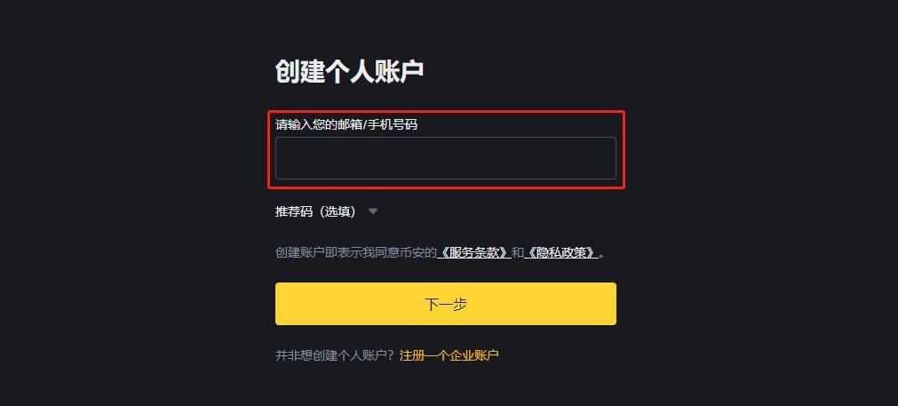 2、币安已全面开放大陆用户进行手机号注册,输入邮箱/手机号、点击下一步即可