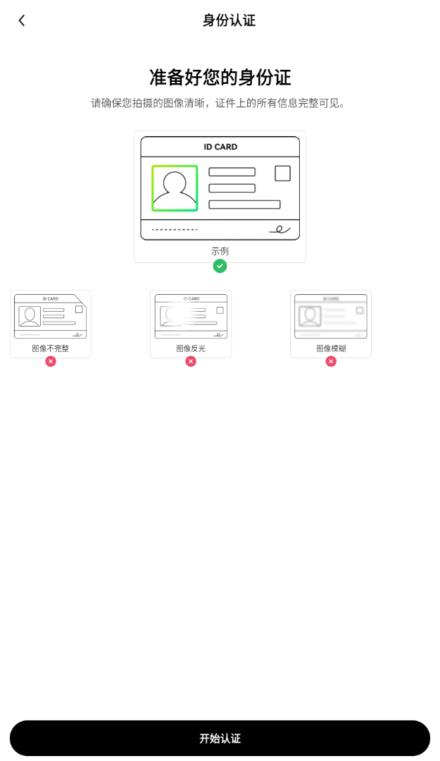 登录账号后,点击左上角个人中心图标--【个资料和设置】--【个人资料】--【身份认证】,进入身份认证页面。如果未完成认证,请点击【立即认证】,您需要上传证件照,如身份件的正反面,并通过人脸识别,根据页面提示完成证件上传和实人认证。