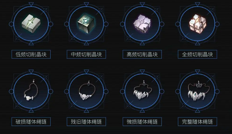 武器突破所需材料包括破损隧体绳链、低频切削晶块、中频切削晶块、微损隧体绳链、完整隧体绳链等,具体数量与阶段分布可参考对应图示说明。