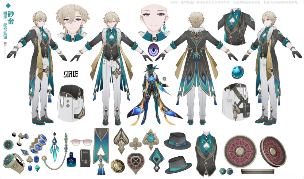 星际和平公司“战略投资部”的高级干部砂金是典型的风险爱好者,以华丽的贵公子的姿态登场。砂金的配色以蓝、绿、黑为基调,服装绅士风度,饰品使用砂金石。为了表现砂金大方高贵的气质,服装中加入了孔雀元素。帽子上有孔雀的羽毛胸针,大衣的下摆参考孔雀的尾巴设计。此外,为了表现砂金喜欢风险的特征,使用了大量“概率游戏”的元素。例如有黑桃型水印的大衣、衬衫和裤脚。腰间皮带上有轮盘标志等。