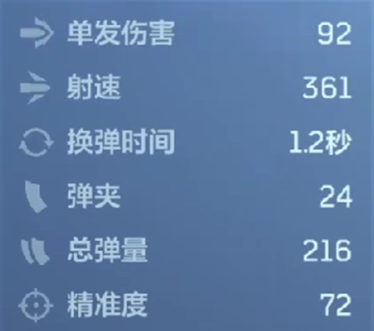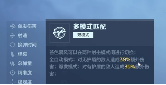 基础参数层面,苔色暴风具备扎实的作战底子:单发伤害稳定在92点,射速达361 RPM,换弹时间仅需1.2秒,配合24发弹匣容量与216发总备弹量,显著强化了持续压制能力与容错空间。真正构成差异化优势的是其双射击模式切换机制——玩家可依战况自由启用“全自动模式”或“爆发模式”。其中,全自动模式对无护盾目标附加30%额外伤害,适用于中近距离快速清场;而爆发模式则对带护盾单位提供30%额外伤害加成,有效破解防御型对手。