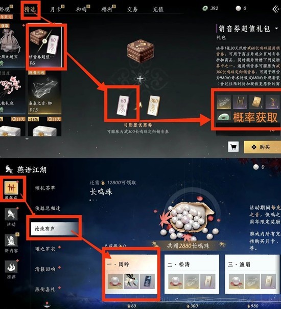 总共可以获取:一张60珠子的无门槛代金券+60珠子+限定折音券1+燕子头像+(概率获取长鸣玉、袅袅等)