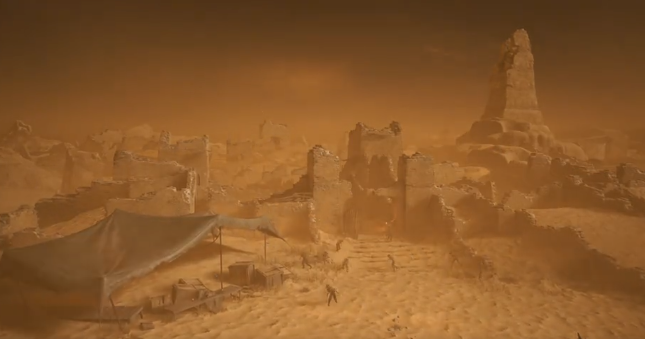 踏入精绝古城,场景即刻切换至苍茫西域边缘。玩家将与胡八一、王胖子等标志性角色组成摸金小队,从西夜遗迹启程,逐步向古城核心区域推进。脚下是风蚀千年的断壁残垣,眼前是斑驳肃穆的古代石构建筑,光影采用低饱和度昏黄色调,沙尘粒子动态模拟真实风感,整体美术风格高度贴合原著设定,营造出强烈的时空穿越感与未知压迫感。