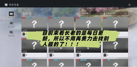 燕云十六声周年活动踏岳寻珍,游侠可以在「奇珍宝鉴」界面追踪鹳长老及其他游侠发布的「寻珍鉴」,获取宝物;也可击败不见山「深泽」、「绥乡」和「天陉」区域内的动物或敌人,将有概率拾取其随身携带的宝物。提交一定套数宝物后,游侠可向鹳长老兑换表情动作[我最棒]、题跋[定珍盘]等奖励。那么这一玩法怎么玩呢?为你准备了一份攻略,一起来看看吧~