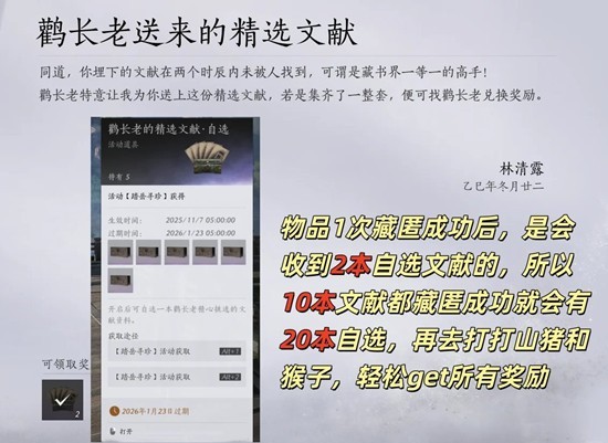 物品1次藏匿成功后,是会收到2本自选文献的,所以10本文献都藏匿成功就会有20本自选,再去打打山猪和猴子,轻松get所有奖励