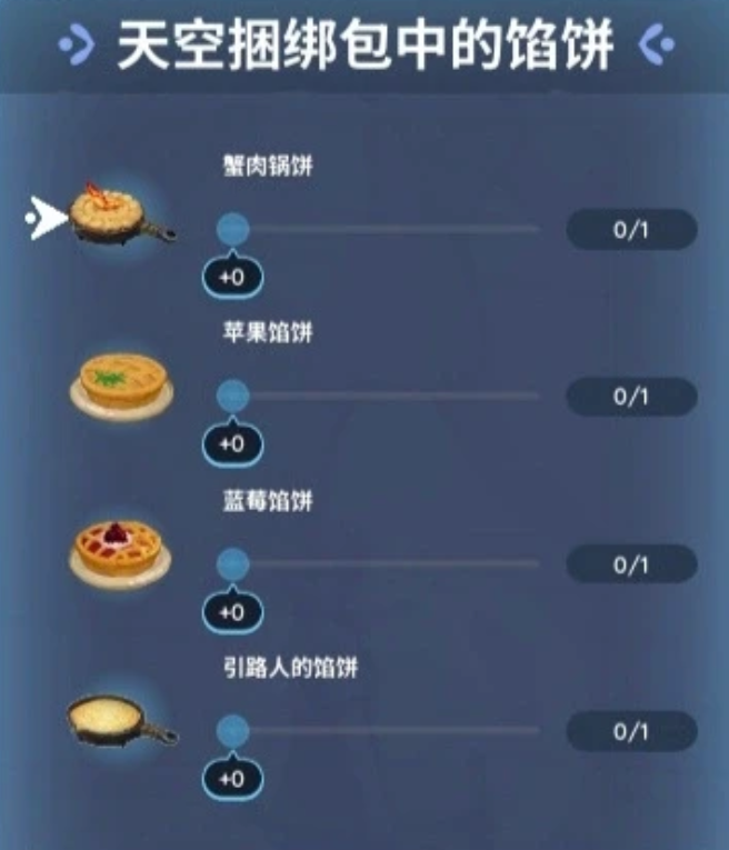 蟹肉锅饼、苹果馅饼、蓝莓馅饼、引路人的馅饼
