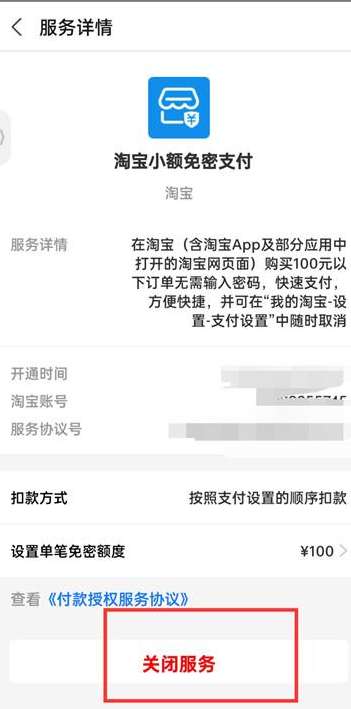 选择小额免密支付功能,进入后即可看到关闭服务的操作按钮。