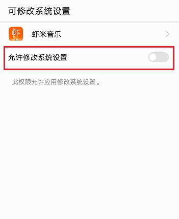 4、然后给虾米音乐App,“允许修改系统设置”的权限。