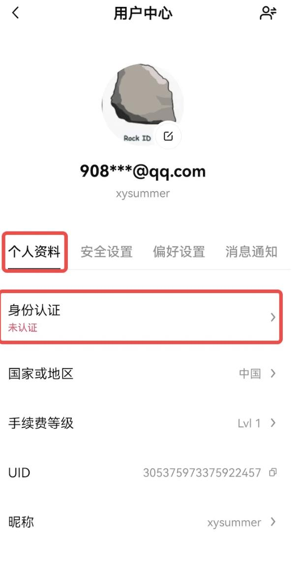 第一步:注册后系统会自动跳转至KYC认证页面,也可通过个人中心手动进入。
