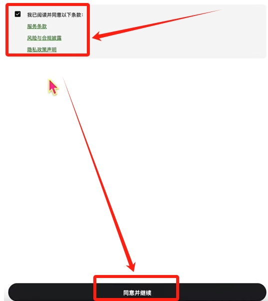 阅读并勾选服务条款后继续操作,若居住地选择有误,需重启APP重新注册流程。