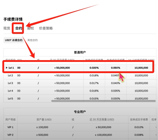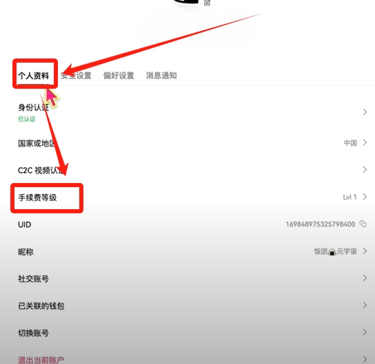 在个人资料板块选择手续费等级选项,即可查看当前费率标准。