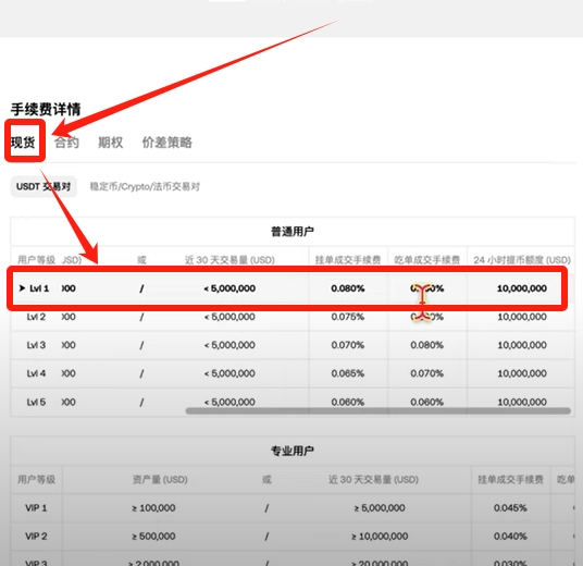 现货交易最低手续费标准为挂单0.08%与吃单0.1%,不同于股票交易的固定最低收费,加密货币按实际交易金额比例收取。