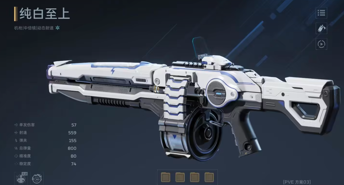 另一款推荐主武器为纯白至上。其面板数据整体优于雷霆999,尤其在伤害成长维度表现突出。主动技能“磐石身躯”开启后提供28%减伤力场,并支持射击叠加增伤:每0.25秒提升8%攻击力,最高可叠加至96%。该效果触发门槛极低,在常规战斗中几乎全程维持满层增益。被动技能“强力冲击”则随持续射击逐步提升射速,最终达成100%加成,使原本已属高速的射击节奏进一步翻倍,显著强化中近距离压制感与清怪流畅度。尽管开箱概率略低于雷霆999,但长期使用价值更高。