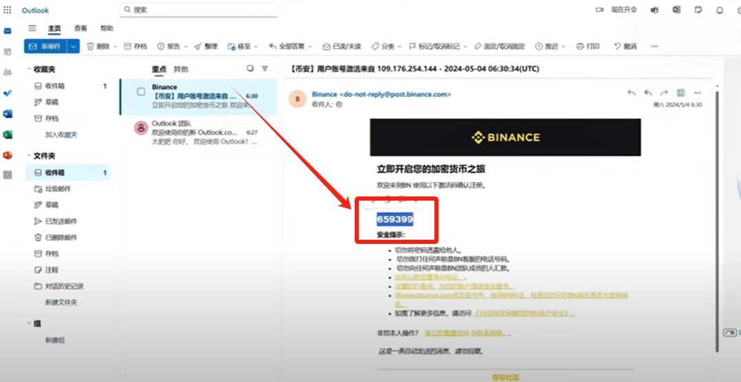 它这里会发送一个验证码到你的邮箱里面,我们去到邮箱复制币安给你发的验证码。