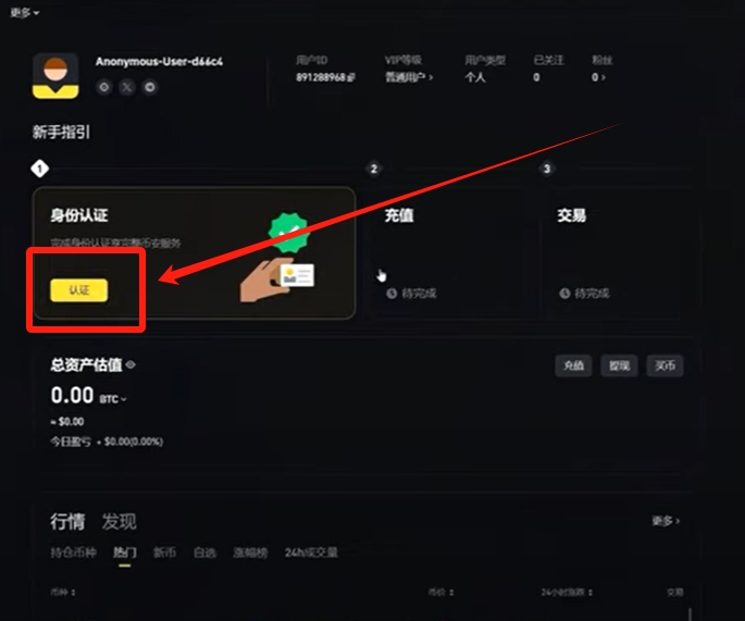 这时候账号注册过程就已经完成了。接下来就是认证了。认证的过程是交易必须要经历的一个过程。大家也不用担心会不会把自己信息泄露什么的。他和股票交易其实很像,都是必须要进行实名认证的,才可以进行出入晶和交易的。这个认证也都是实名认证。我们点击【认证】。