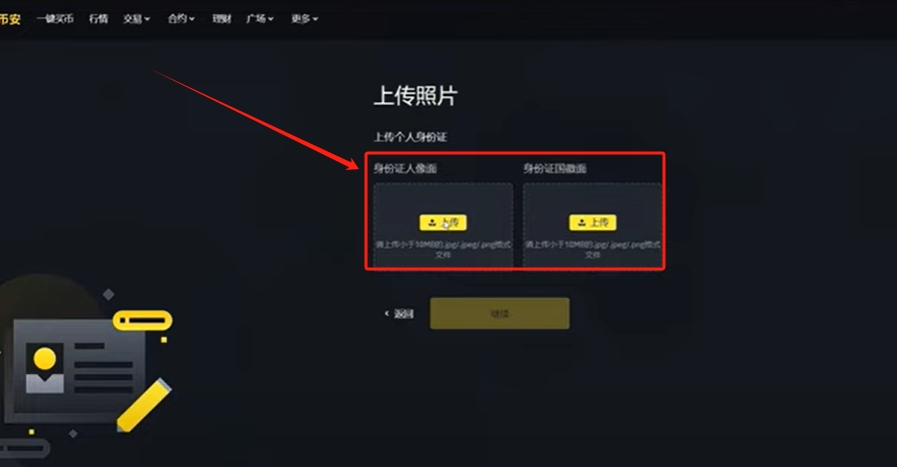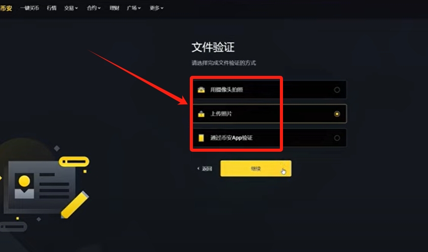 再往下就是要验证证件信息了。这里有摄像头拍摄、上传照片、通过币安APP验证,如果你是笔记本或者说是你电脑有摄像头的话,你就可以选择第一个和第二个进行认证。因为它最后会有一个视频验证人脸,如果你没有摄像头就认证不了。我这里就不尽心过认证了。