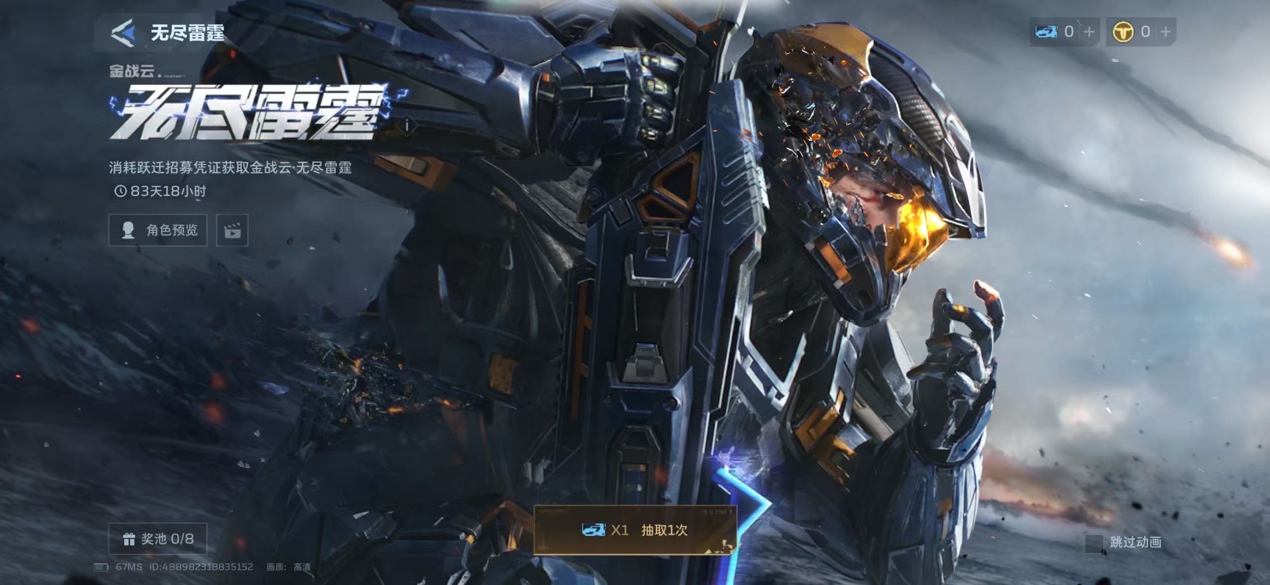 游戏内核心付费路径聚焦于外观收集体系。不同于常规角色可直接购买获取,“金战云-无尽雷霆”属于限定概率获取外观,必须消耗“跃迁招募券”参与专属卡池抽取。该招募券并非商城直售道具,而是绑定于【逆战未来】称号——玩家每成功购买一次该称号,系统即自动赠送1张跃迁招募券。