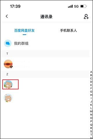 进入通讯录页面,选择一个需要分享文件给他的好友;