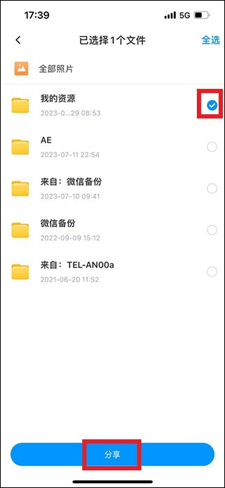 进入选择文件页面,勾选需要分享的文件,点击下方的“分享”按钮即可。