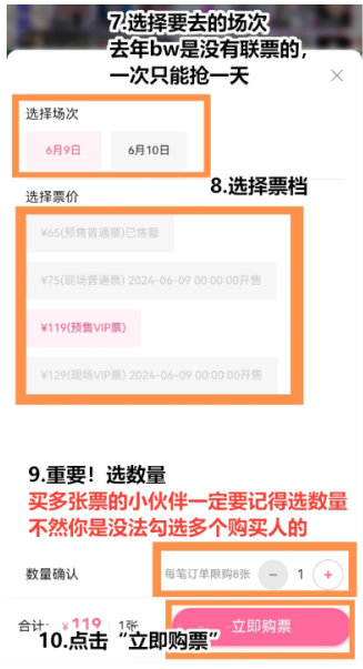 6. 开票后选择场次、票种及数量,点击"立即购票"