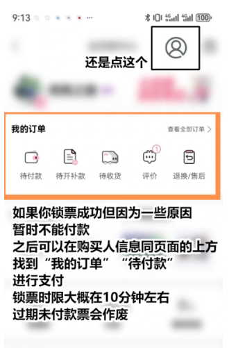 8. 若锁票后需延时支付,可在"我的订单-待付款"中操作(锁票有效期约10分钟)