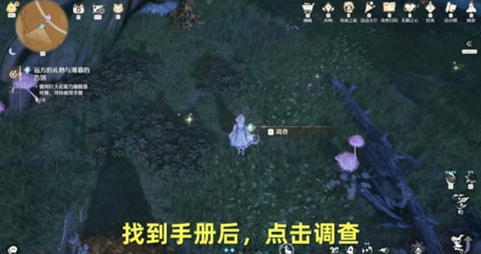 对完话,跟随指引,用巨大化能力撞散落叶堆,找到手册;(是距离最远的那个落叶堆里)