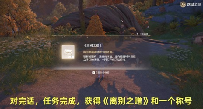 进入剧情,结束后,任务完成,获得《离别之赠》以及一个称号;