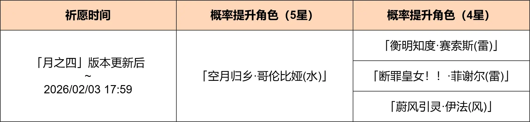 ●活动期间,限定5星角色「空月归乡·哥伦比娅(水)」的祈愿获取概率将大幅提升!