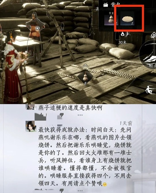 然后回大火堆那有一堆士兵,听风辨位,看谁身上有烧饼就把谁哄睡着。懂得都懂,不会被报官的。哄睡服务直接获得四个,不用去领四天。