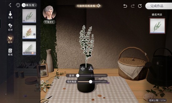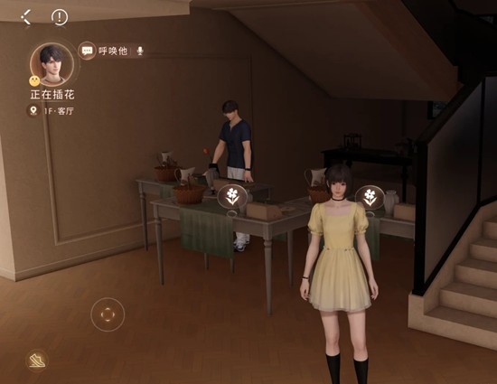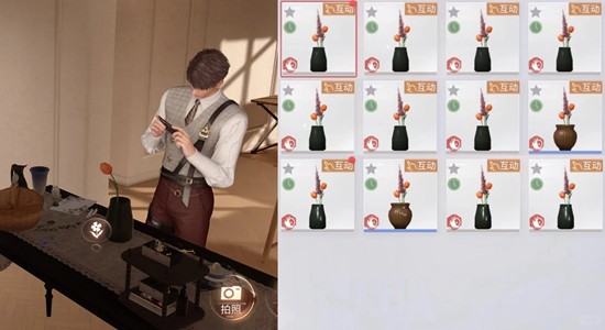 在插花桌前给男主送他喜欢的花,送到他冒开心泡泡,他有概率会去主动插花