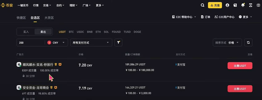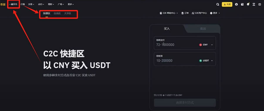 登录后点击首页"一键买币"进入交易界面,选择自选区进行C2C交易。