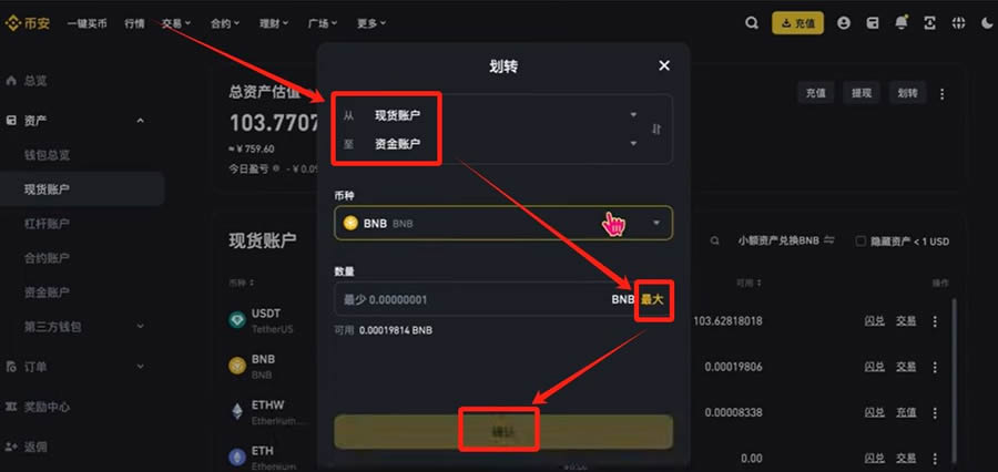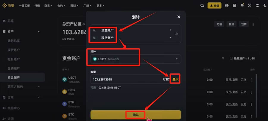 通过资金划转功能将USDT转入现货账户开始交易。