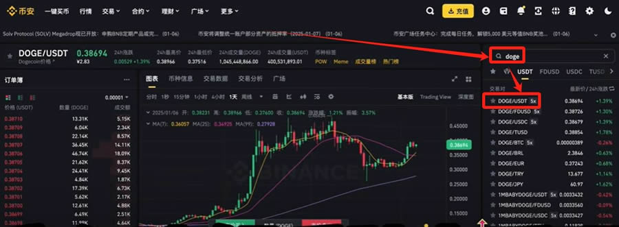 在现货交易区搜索目标币种如DOGE,选择合适交易对。
