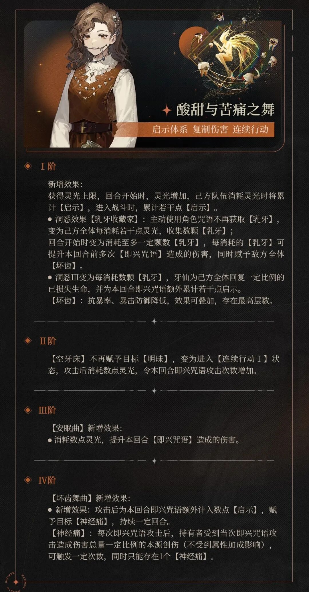 重返未来1999游戏里牙仙的狂想名为酸甜与苦痛之物,狂想以后能够让她从奶妈转型为适配木启示队与星系启示队的增伤辅助,以下是对牙仙的狂想增幅效果说明。