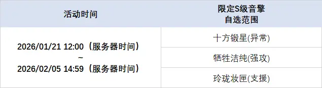 「独家重映」&「音擎回响」自选频段限时开启,调频活动时间为:2026/01/21 12:00 ~ 2026/02/05 14:59,包含如下内容: