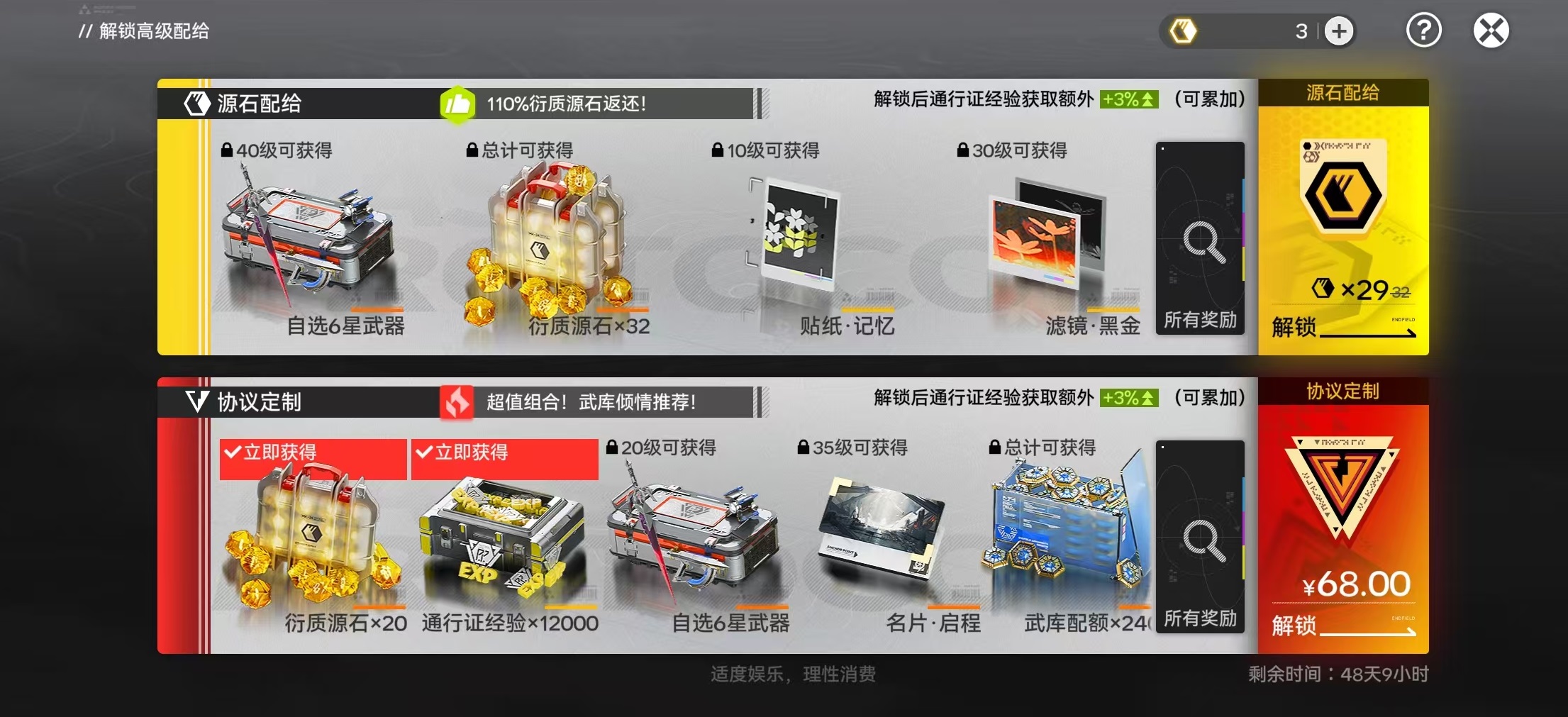 从资源效益最大化角度出发,推荐优先达成29枚衍质源石的储备目标,用于立即激活通行证中的“原石配给”模块。该模块生效后,可获得110%的原石返还加成,实质相当于以零成本持续获取各类成长资源;后续升级还可领取自选武器箱、主题贴纸及场景滤镜等限定外观道具。完成此项解锁后,剩余衍质源石再统一兑换为嵌金玉,集中投入关键卡池提升干员抽取效率。
