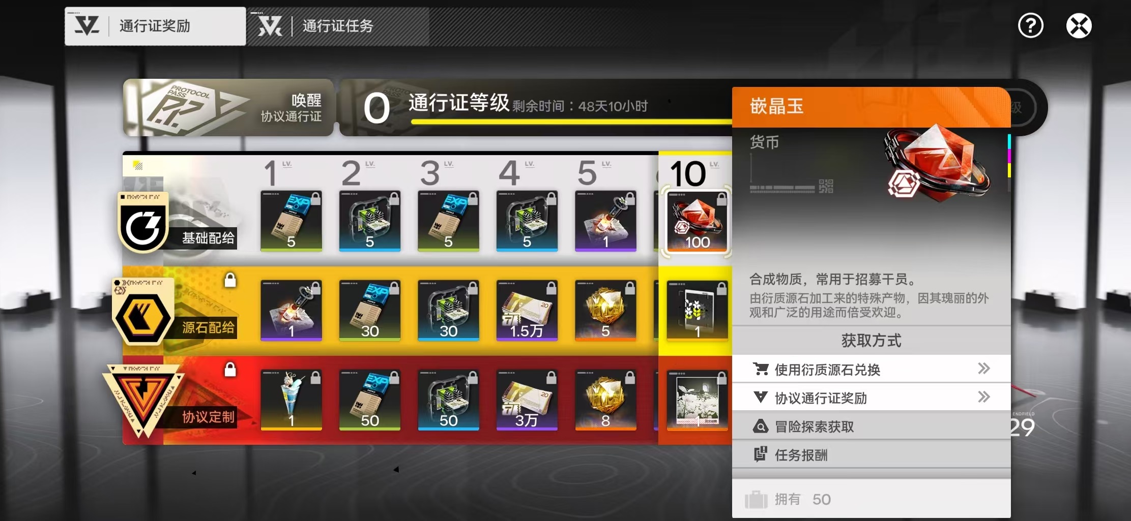 嵌晶玉由衍质源石经特殊工艺提纯而成,具备稳定产出机制与明确用途指向。目前所有获取路径均围绕四大主渠道展开:衍质源石兑换、协议通行证等级奖励、冒险探索事件结算、以及主线与日常任务报酬。